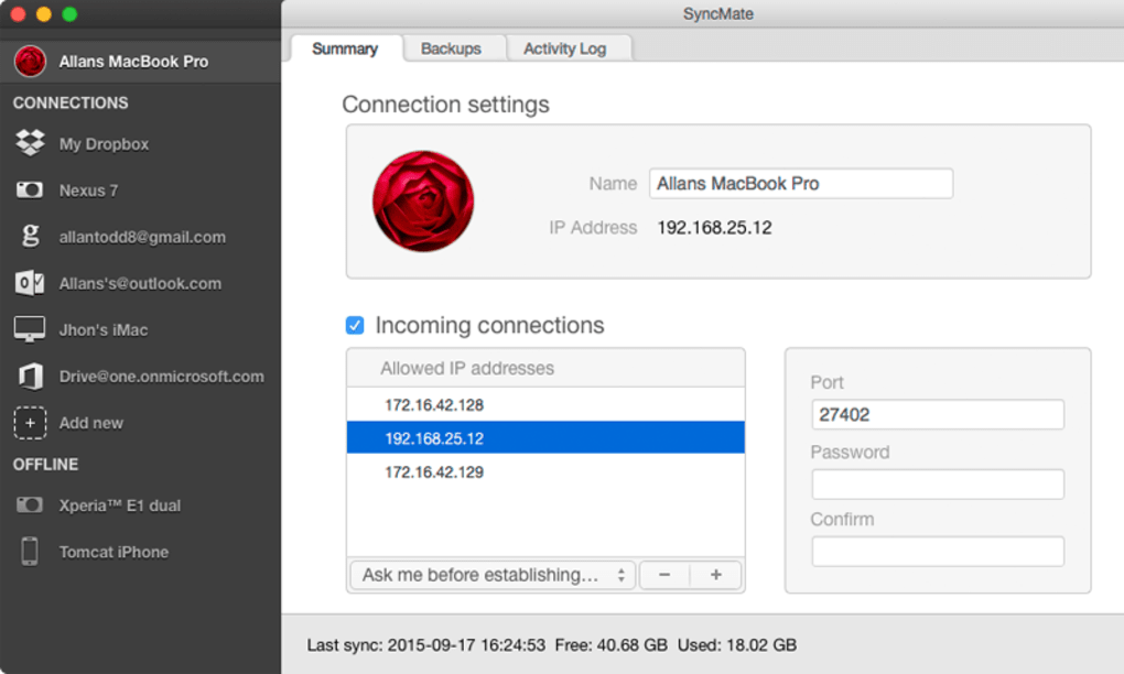 Apart from the above mentioned Android devices, SyncMate gives the freedom to sync data on the Mac device with the help of online storage (Dropbox, Google, iCloud), Google, Windows services (Office 365 Home, Outlook and Business accounts), any attached devices along with MTP devices at the same time. So, it really seems to be amazing in all respects.